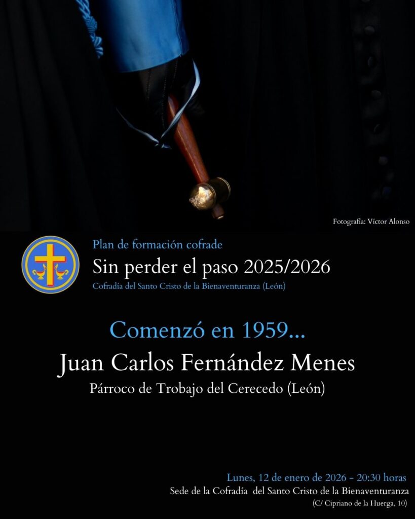 Tendrá lugar el lunes 12 de enero a las 20:30 horas en la sede de la cofradía, situada en la Calle Cipriano de la Huerga, N.º 10. Correrá a cargo de Juan Carlos Fernández Menes (párroco de Trobajo del Cerecedo, León). El tema que se va a desarrollar será “Comenzó en 1959…”.