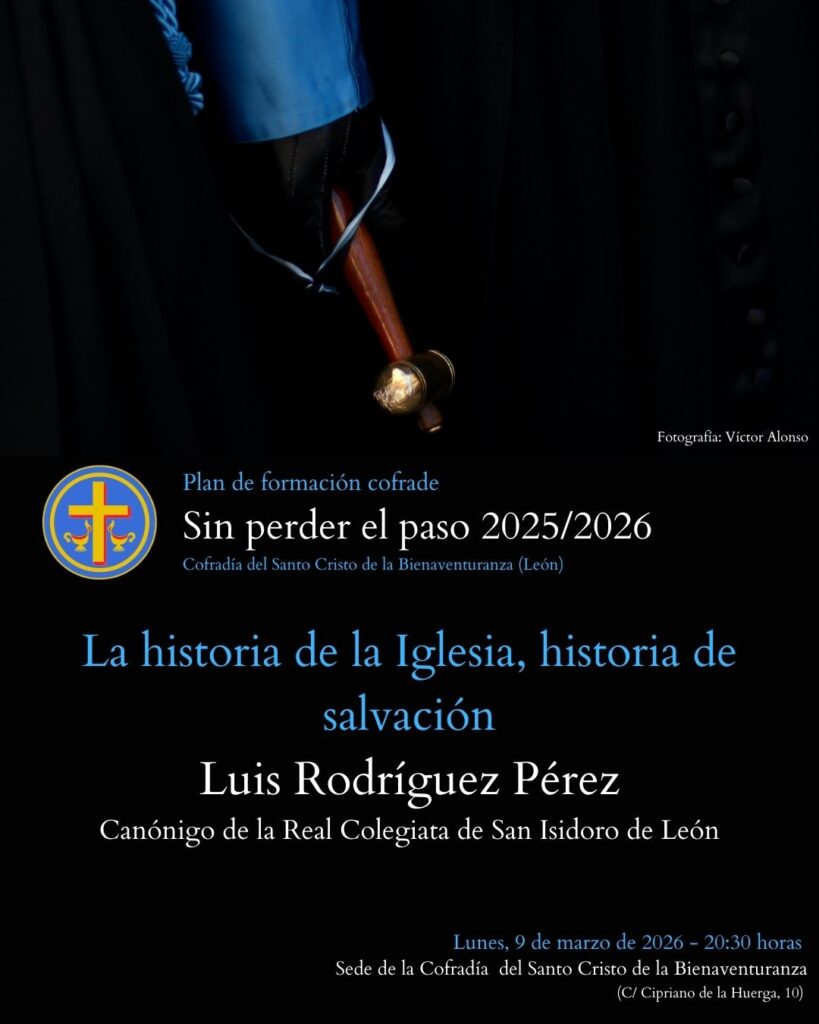 Tendrá lugar el lunes 9 de marzo a las 20:30 horas en la sede de la cofradía, situada en la Calle Cipriano de la Huerga, N.º 10. Correrá a cargo de Luis Rodríguez Pérez (Canónigo de la Real Colegiata de San Isidoro de León). El tema que se va a desarrollar será “La historia de la Iglesia, historia de salvación”.