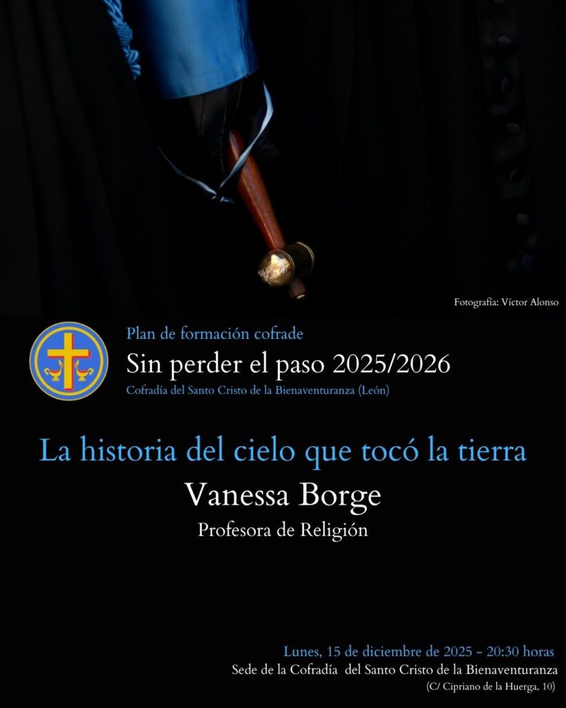 Tendrá lugar el lunes 15 de diciembre a las 20:30 horas en la sede de la cofradía, situada en la Calle Cipriano de la Huerga, N.º 10. Correrá a cargo de Vanessa Borge (profesora de religión). El tema que se va a desarrollar será “La historia del cielo que tocó la tierra”.